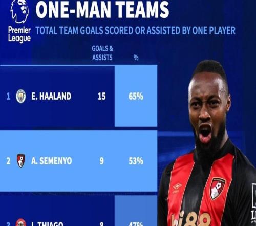 11月18日,德转列出了英超本赛季参与进球占全队总进球比例的球员排名,哈兰德以65%排在了榜首,伯恩茅斯前锋塞门...