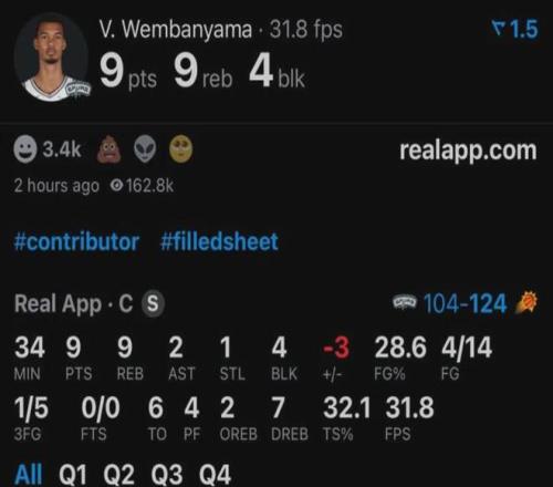 但不知道是昨晚没睡好还是今天吃错了东西,文班亚马在进攻端状态全无,虽然还有精彩的护筐,但上半场投篮是5投1中。