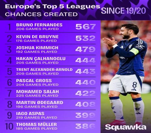 1920赛季起五大联赛创造机会榜:B费567次第1,丁丁532次第2